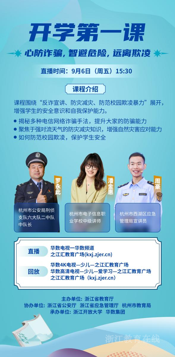 在新学期开学之际,为提高广大师生和家长的安全知识和意识,增强应对安全事故的能力,将于9月6日(星期五)面向全省中小学开设主题为“心防诈骗,智避危险,远离欺凌——共创安全校园”的“开学第一课”。