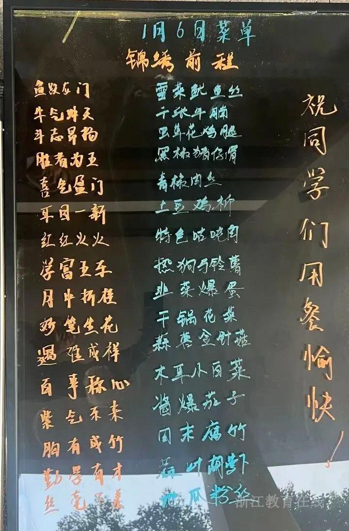 首考第一天,杭州学军中学的食堂专门推出了一份“锦绣前程”菜单,上面每道菜都是满满的祝福。明天是“一举夺魁”套餐,后天是“猛龙过江”菜单。