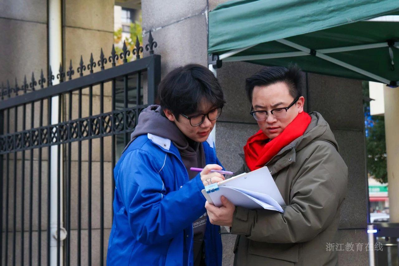 浙江省杭州第十四中学校长陈利民和老师们早早在校门口迎接考生。