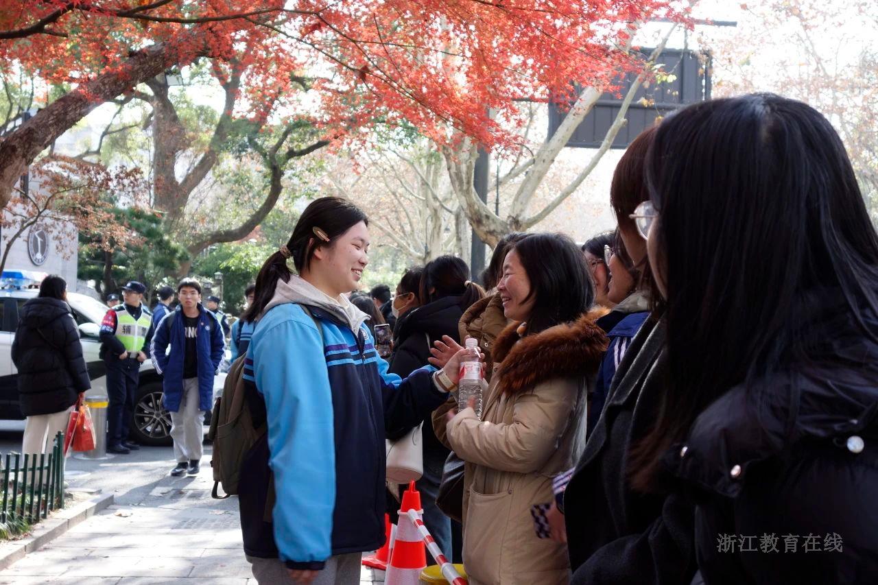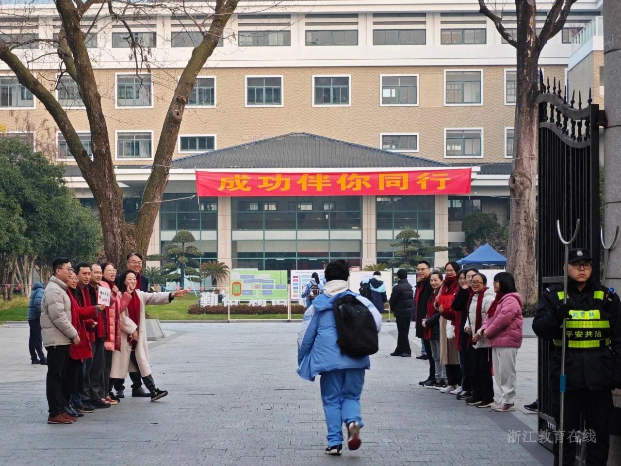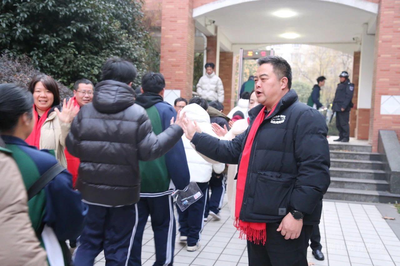 杭州师范大学附属中学的老师们6:30就齐刷刷地在校门口等着学生,和孩子们握手助阵。