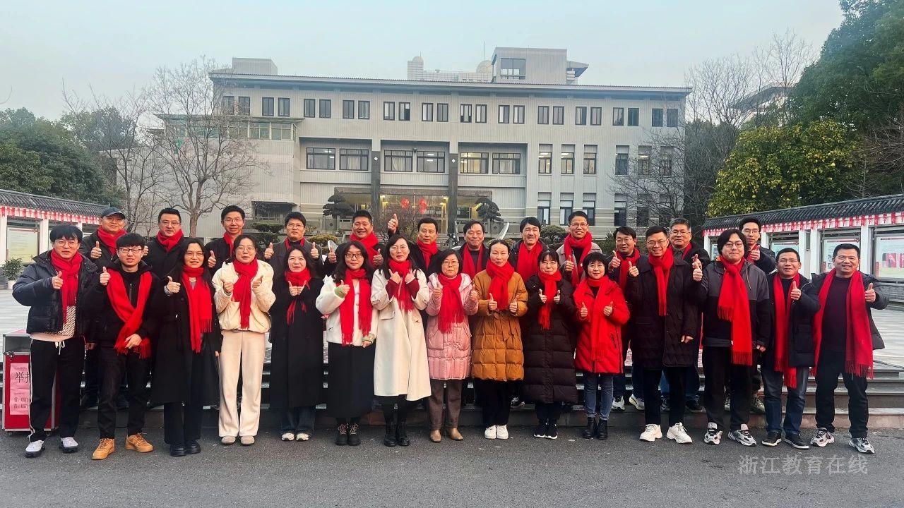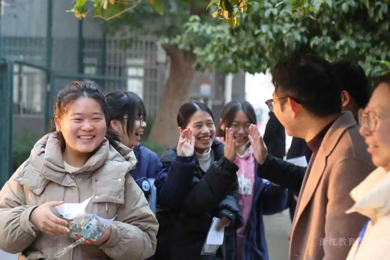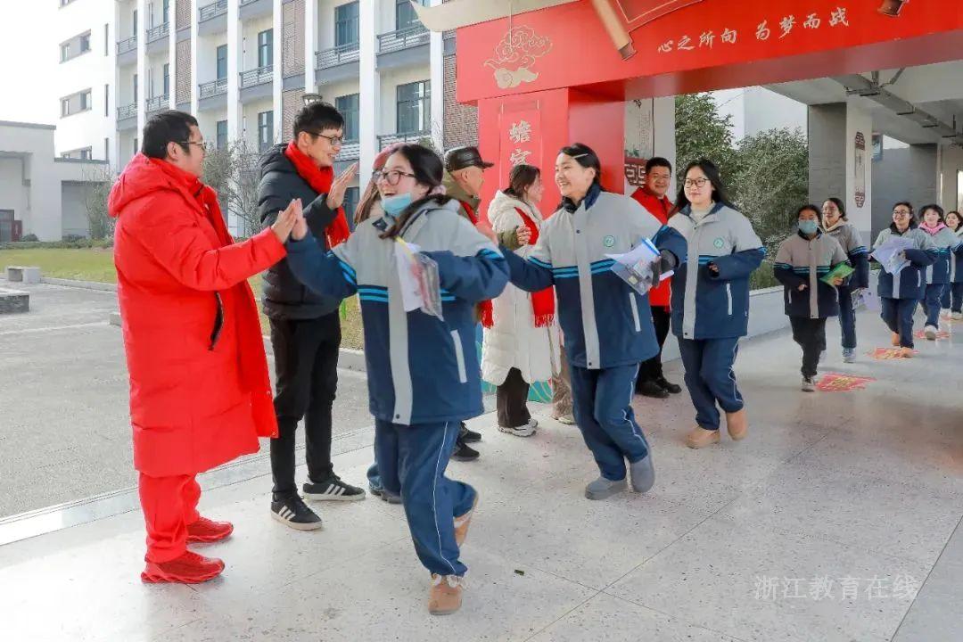 宁波市惠贞书院高中部的地理徐老师穿着红色羽绒服,希望给学生们带来好兆头。