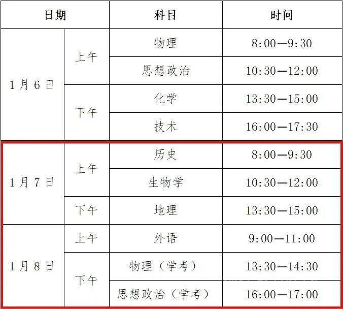 外语听力考试开考前15分钟(即1月8日8:45)后,禁止迟到考生进入考场;其他科目开考15分钟后,考生不得进入考点参加当次科目考试。
