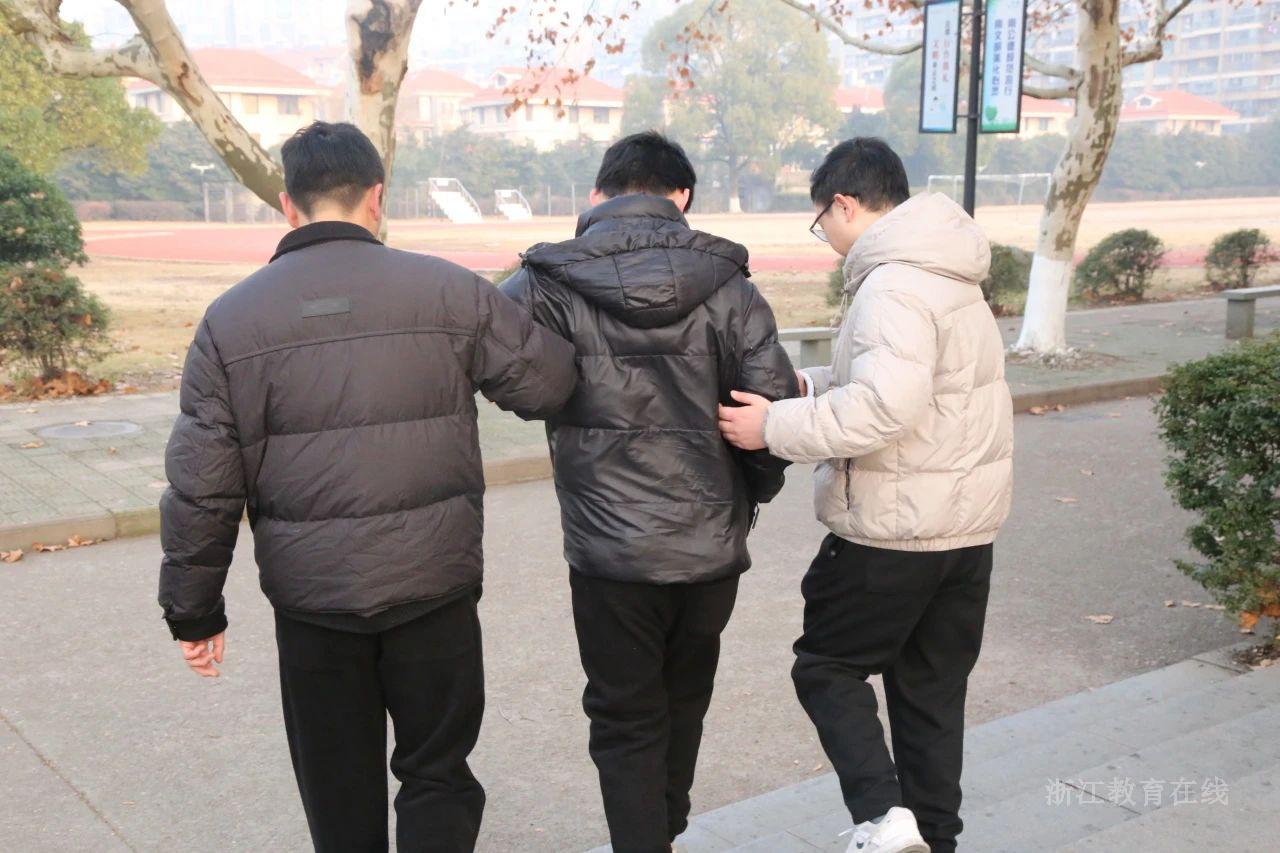 江山实验高级中学考点迎来了一位特殊考生,他在老师们的帮助下顺利进入备用考场参加考试。