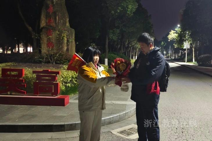 首考在即,吴兴高级中学宿管团队为第一个出寝室的考生送上向日葵花束。
