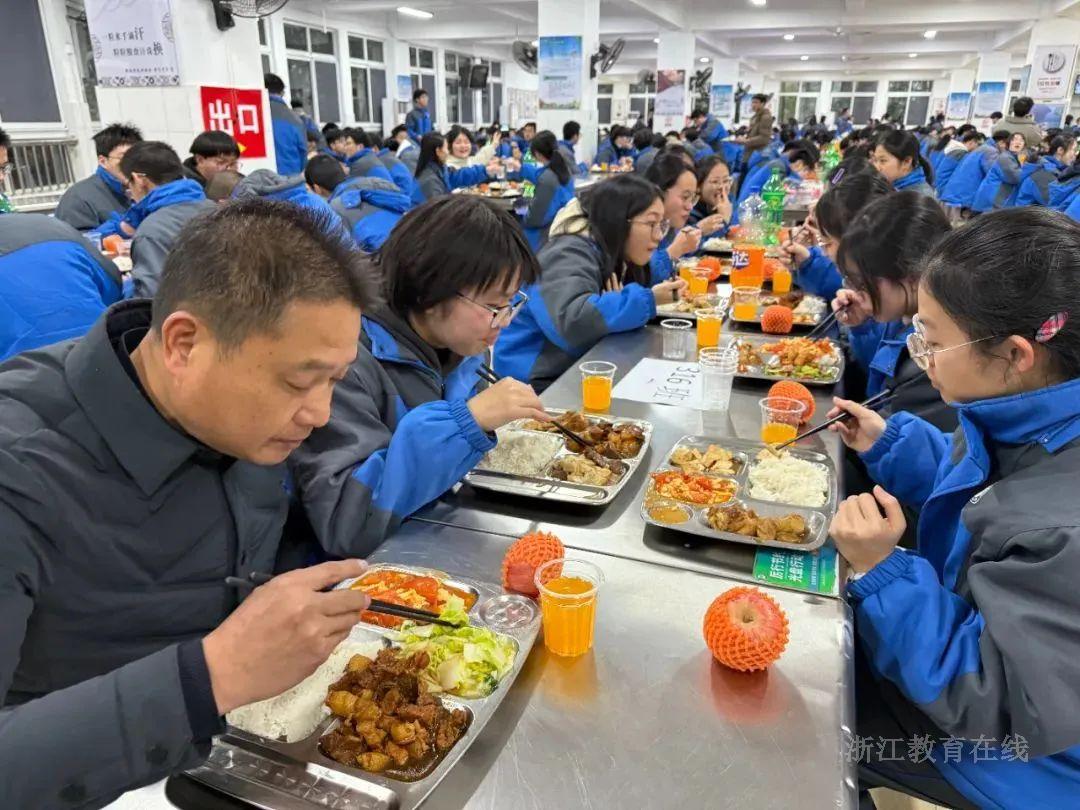 景宁畲族自治县景宁中学免费给学生提供营养餐,校长陪高三学生吃饭。