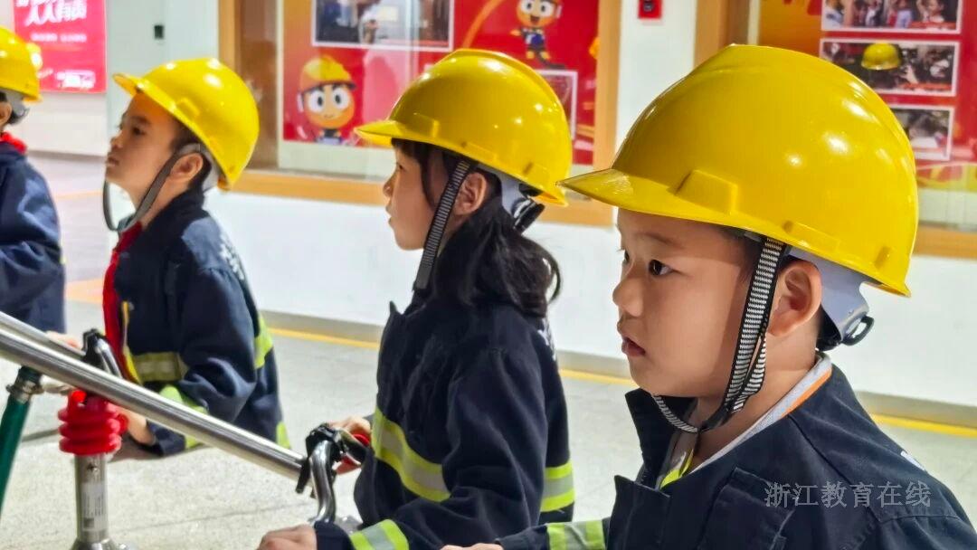 杭州市西兴实验小学的学生走进青少年消防应急安全体验馆,体验酒店逃生、消防灭火等日常应急场景。