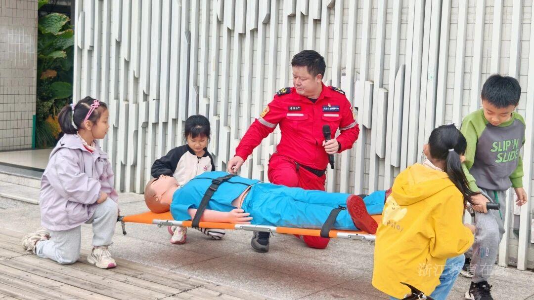 在杭州市夏衍小学,消防员借助急救假人进行消防安全及急救知识科普。