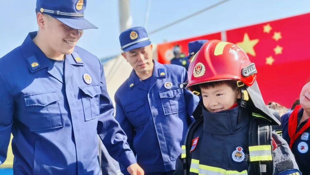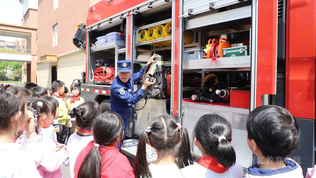 绍兴市柯桥区实验小学坂湖校区邀请消防救援支队走进校园,带学生“零距离”接触各种消防器材。