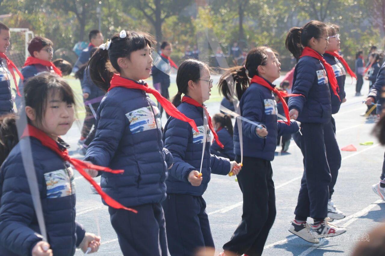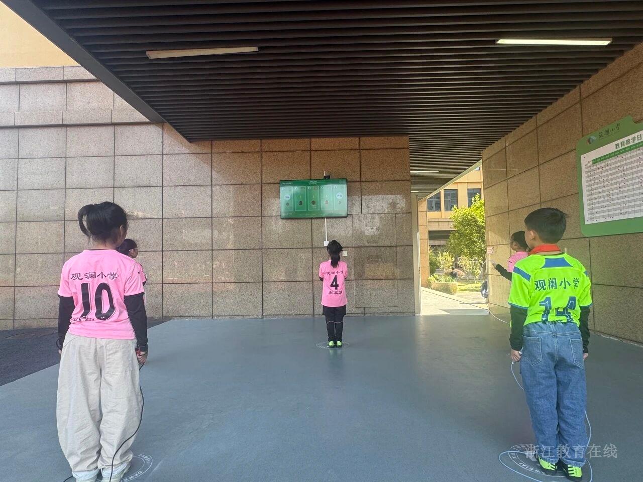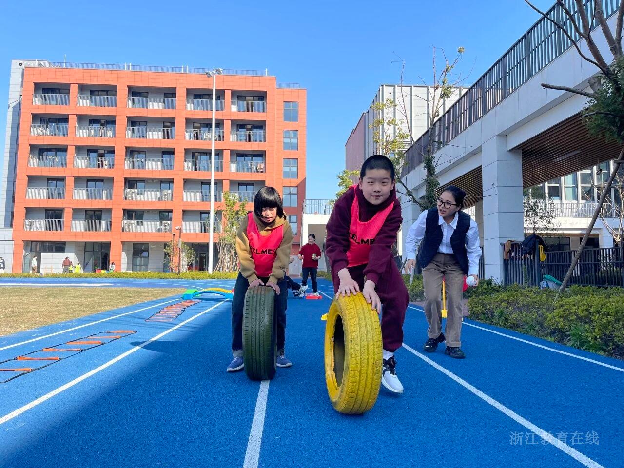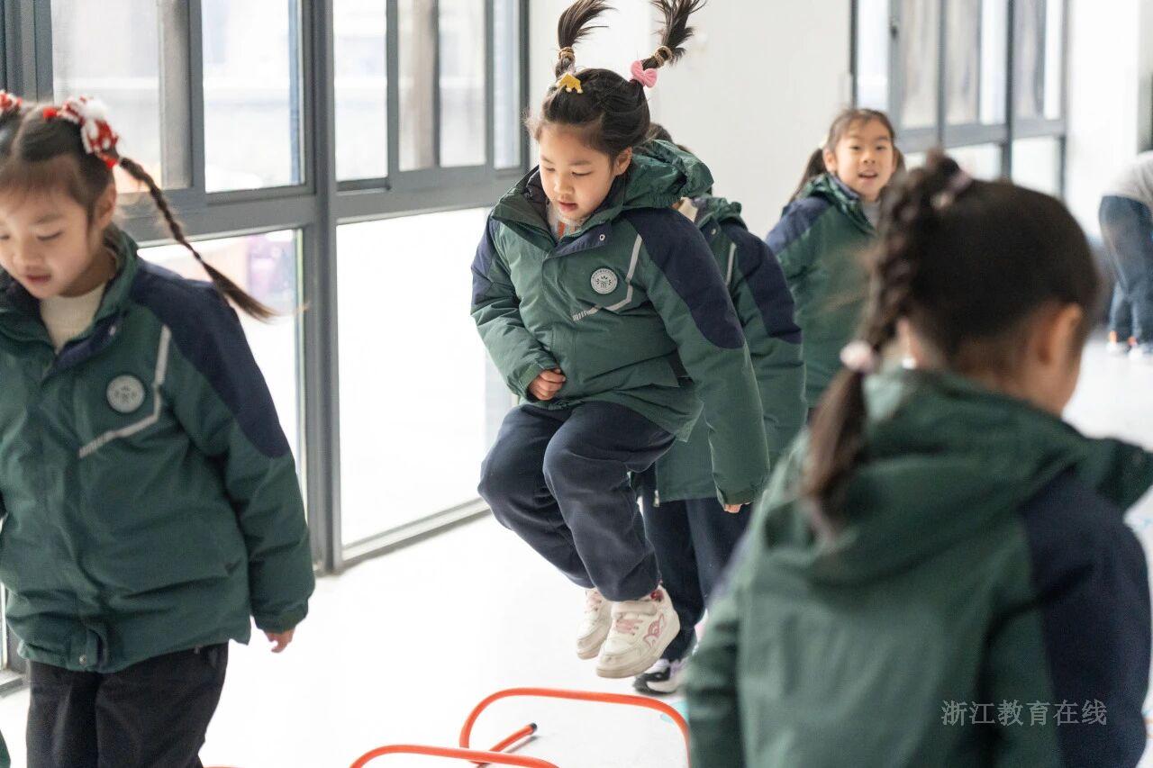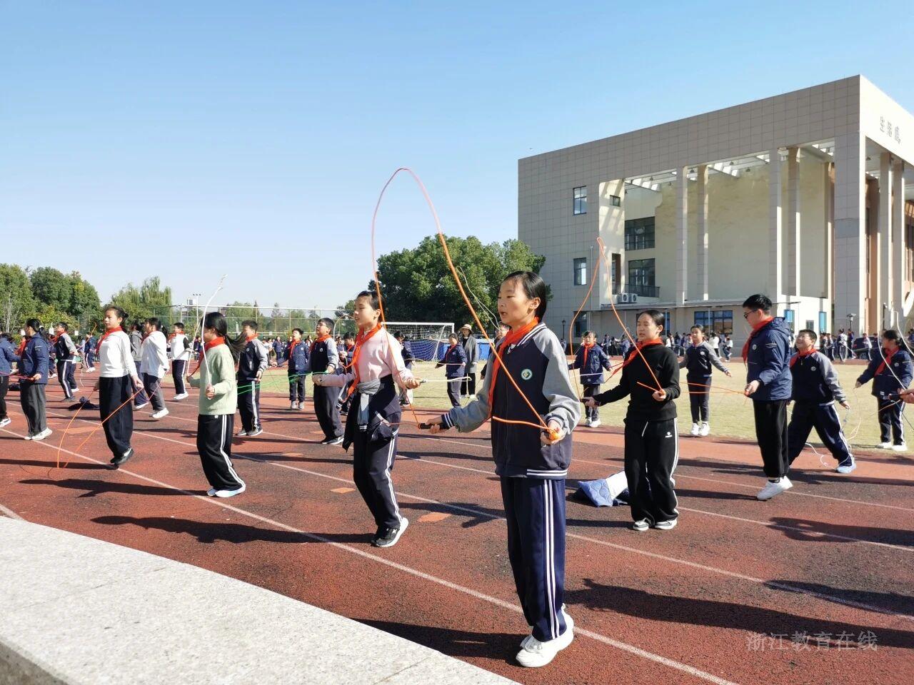 ▲宁波市北仑区岷山学校引入体能、手环等智慧体育设备,开发花样跳绳操、地面游戏等特色项目,让学生乐动善动。