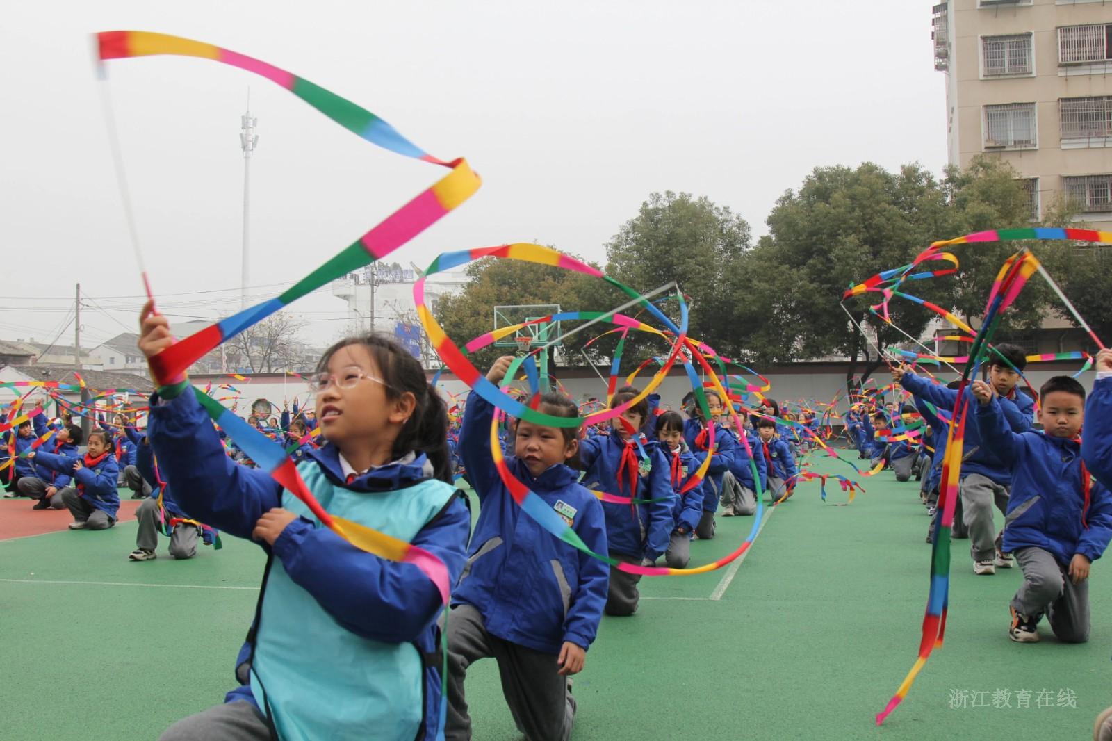 ▲天台县街头镇中心小学将学生喜爱的音乐编成啦啦操加入大课间活动。