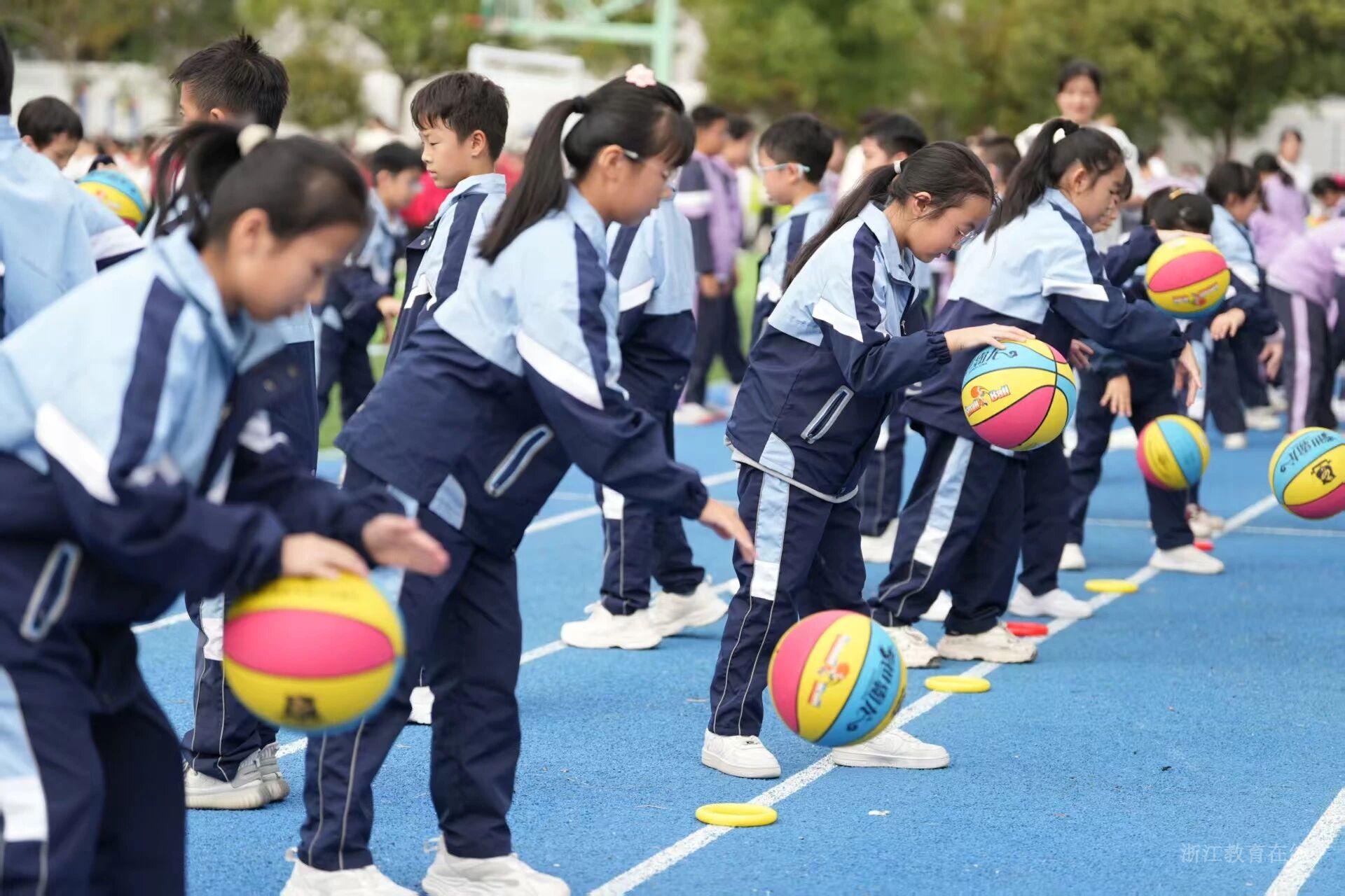 ▲桐庐县洋洲小学将大课间活动分为两个时段,采用项目化轮转活动模式来解决学生人数众多与场地资源有限的矛盾,活动每8到10分钟进行一次轮换,学生可在一次大课间内参与篮球、足球、趣味游戏等4至6个不同项目。
