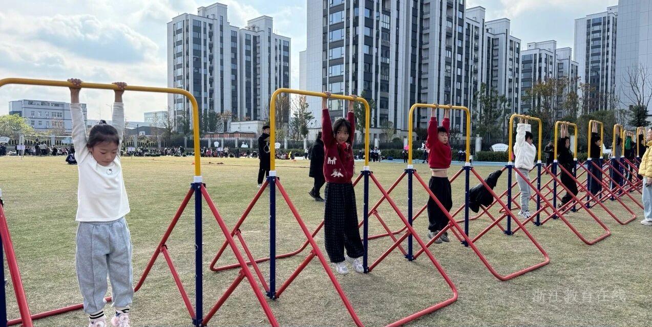 ▲衢州市衢江区东港小学开展挂杆活动,评选“挂杆王”激励学生参与。