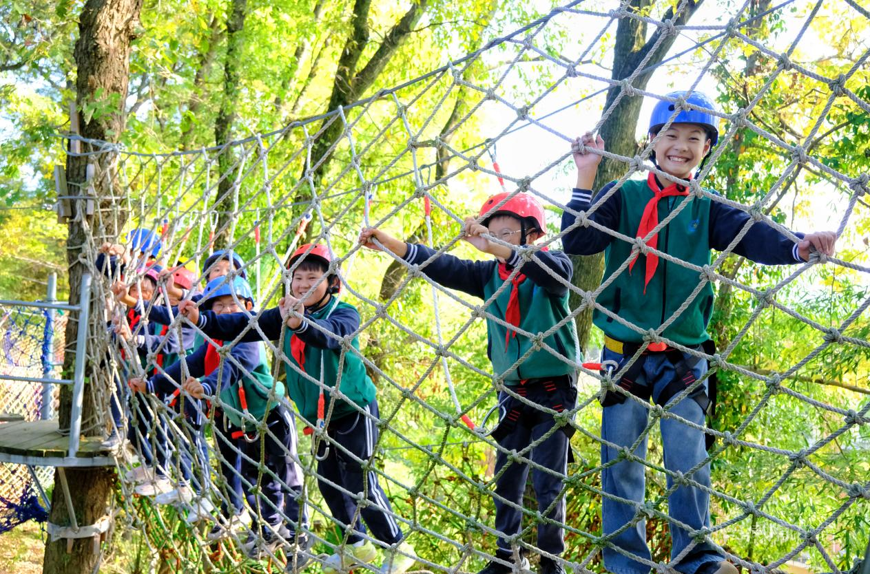 ▲杭州市临安区高虹镇小学把体育课搬到了“户外”,丛林穿越、峭壁攀岩等活动让学生们在挑战中释放天性。