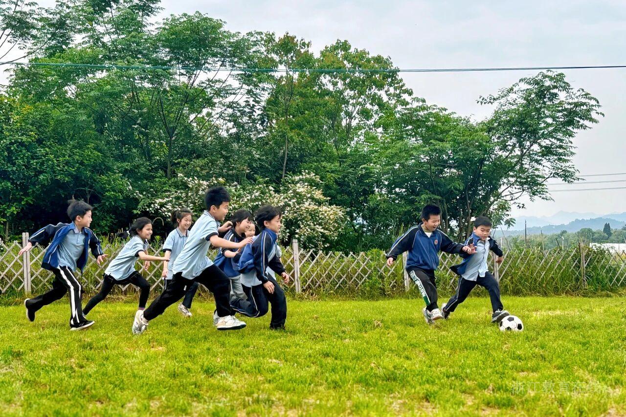 ▲永康市城南小学围墙外的草坪就是天然足球场,大课间,学生们常常在教师带领下来一场田野里的足球赛。