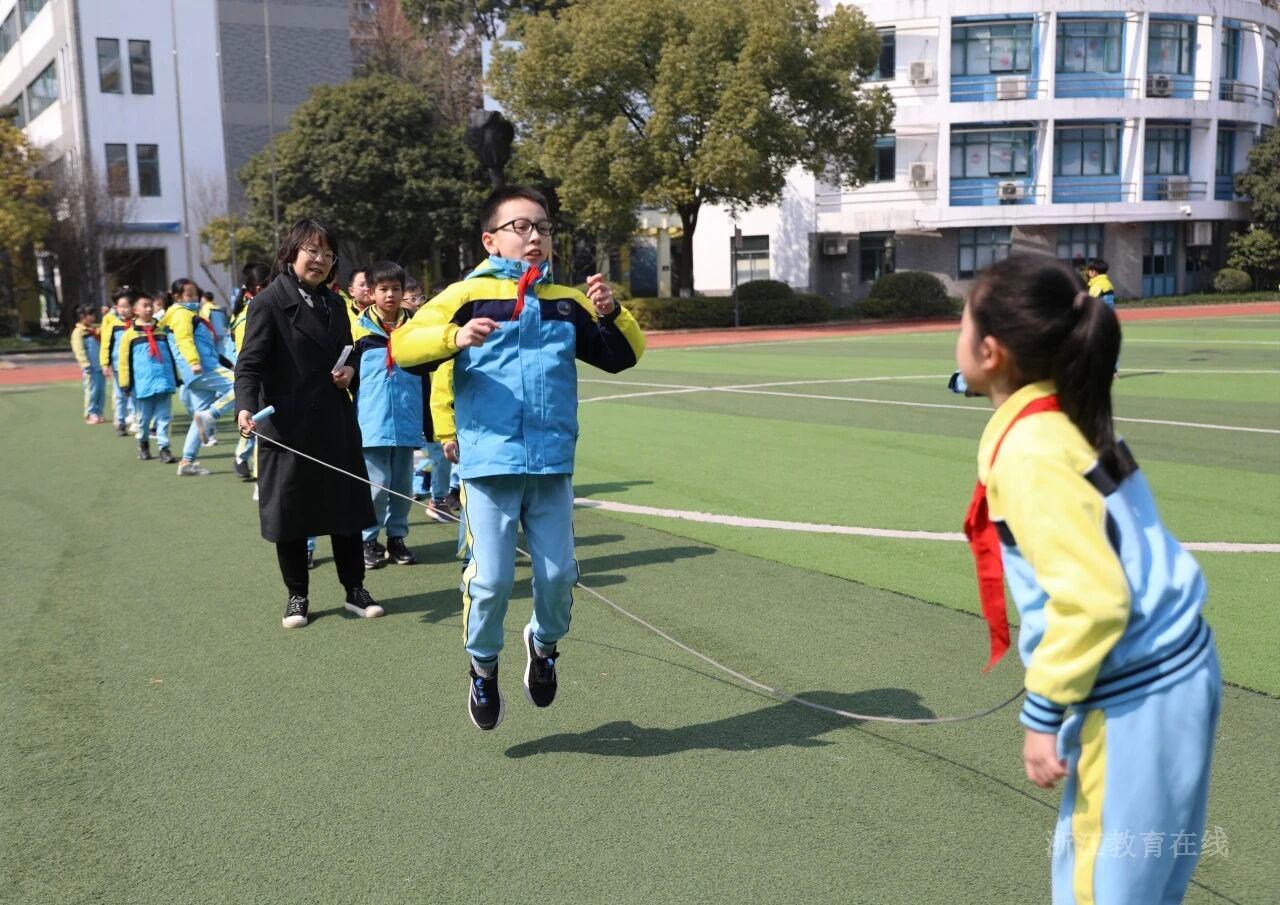 ▲杭州天成教育集团以“一校一品”跳绳特色为抓手,分年级在小课间开展短绳、长绳练习,大课间全校普及绳操、武术操。
