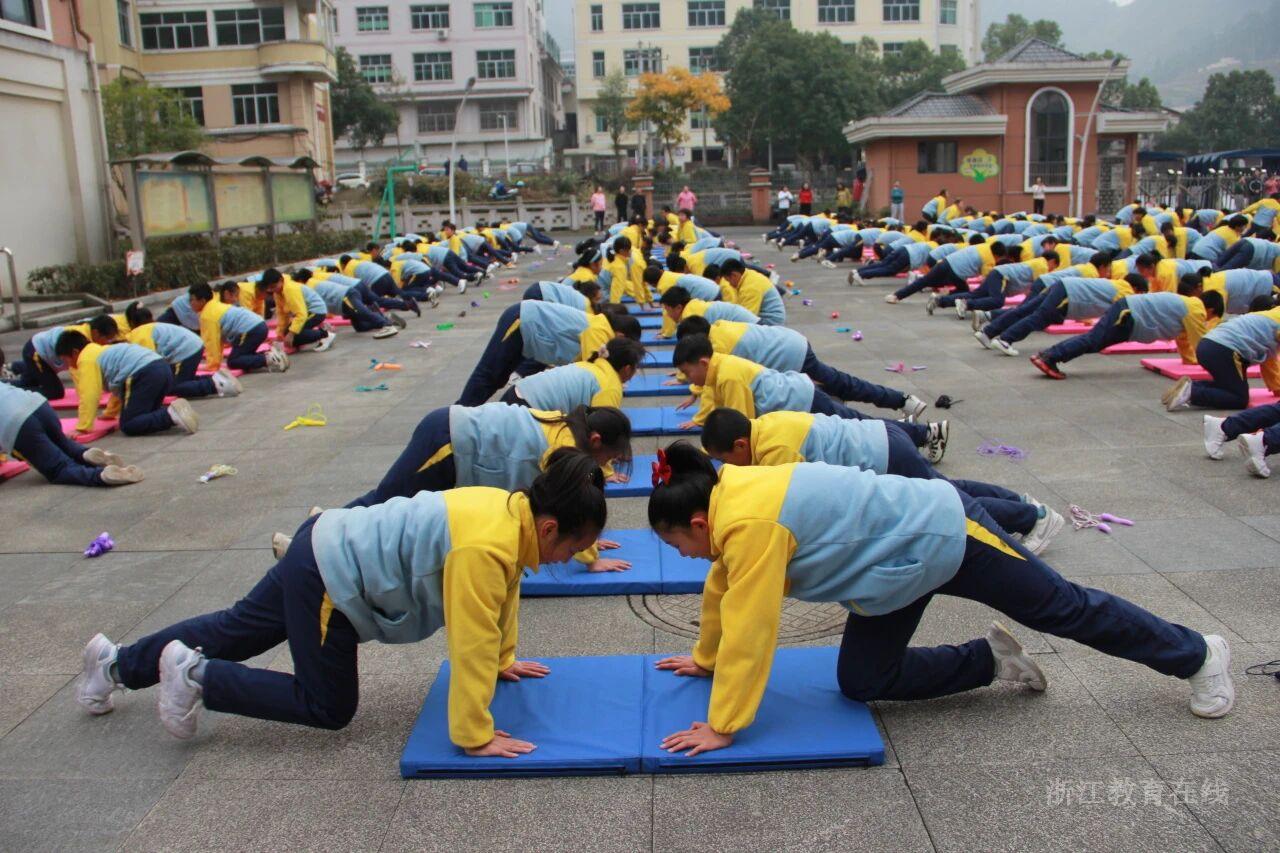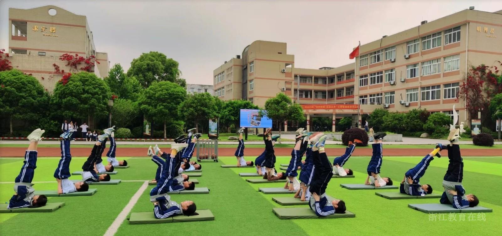 ▲桐庐县富春江初级中学创新实施“体能套餐”式大课间,分年级活动并提供“一生一策”运动指南。