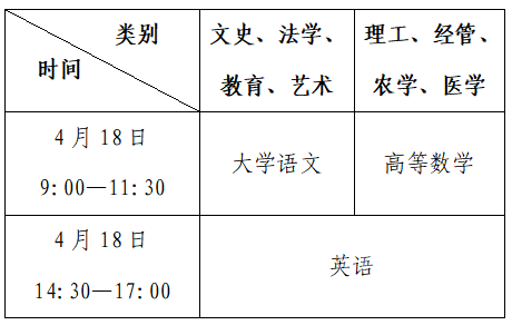 文史、法学、教育、艺术四类的考试科目为大学语文和英语;理工、经管、农学、医学四类的考试科目为高等数学和英语。各科满分均为150分。考点设在设区市,各科目考试时间如下: