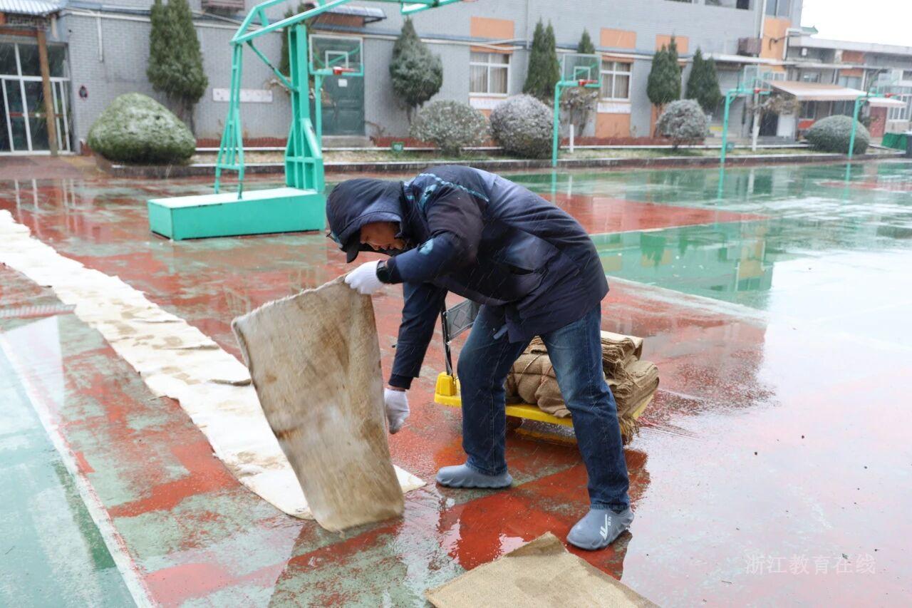 湖州市织里镇轧村小学教师们在容易积水的路段铺上草堆,防滑护行暖人心。