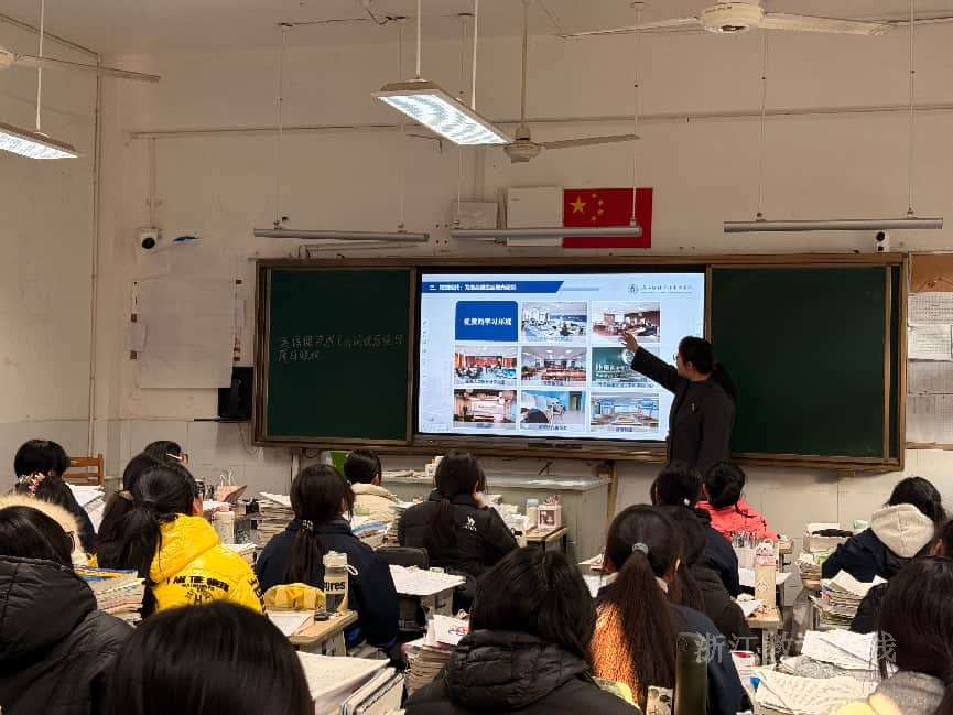 在求是高级中学,实践团队成员通过结构清晰、图文并茂的PPT演示,引领在场高三学子进行了一场“云游东方”的沉浸式体验。从绿树成荫、楼宇林立的现代化校园景观,到设施完备、温馨舒适的学生公寓;从藏书浩如烟海、学习氛围浓厚的图书馆,到设备先进、助力创新的各类实验室;从精彩纷呈、百花齐放的社团活动,到贴近产业、注重实践的校企合作平台;从介绍学院的学科专业优势、师资力量、奖学金体系,到近年来大学生在各类竞赛、升学就业方面取得的成绩,帮助高中生们勾勒出未来大学生活的图景。