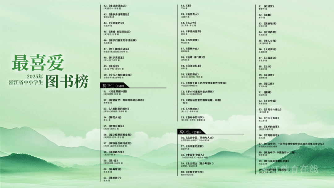 看完这份榜单,真是让人感慨。这份榜单里有不变的坚守,也有可喜的成长。它记录了当下浙江青少年在阅读中汲取力量、在书香中丰富自我的生动图景。