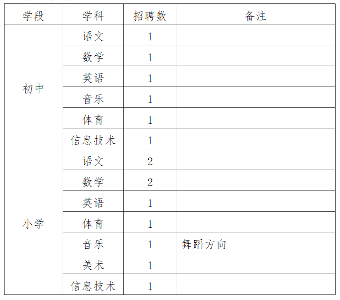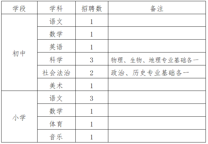 1.面向2020年全日制普通高校(含师范和非师范专业)应届毕业生(具有教育部留学服务中心出具的2020年毕业的境外学历、学位认证书的视同)招聘初中有关学科教师6名、小学有关学科教师9名,具体见下表: