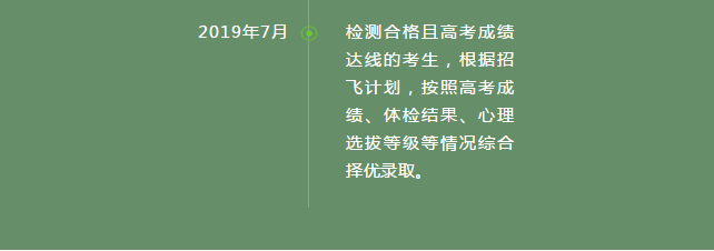 高考结束后,考生按通知分批次到北京海军招飞检测中心参加定选复查,合格的按高考成绩和检测结果投档录取。录取通知书于7月中旬发放,录取院校为海军航空大学。高考成绩优异者可推荐至北京大学、清华大学和北京航空航天大学进行“双学籍”军地联合培养。