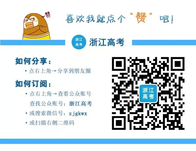 快拿出手机,扫描一下二维码↓↓或搜索微信公众号zjgkwx,关注“浙江高考”,就是关注了孩子的未来!